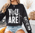 Direct To Film Transfer on clear film and the size is 10.5x11 in size. Great for sizes Small to XLarge. Does not include sweatshirt. Included is arm and shirt transfer